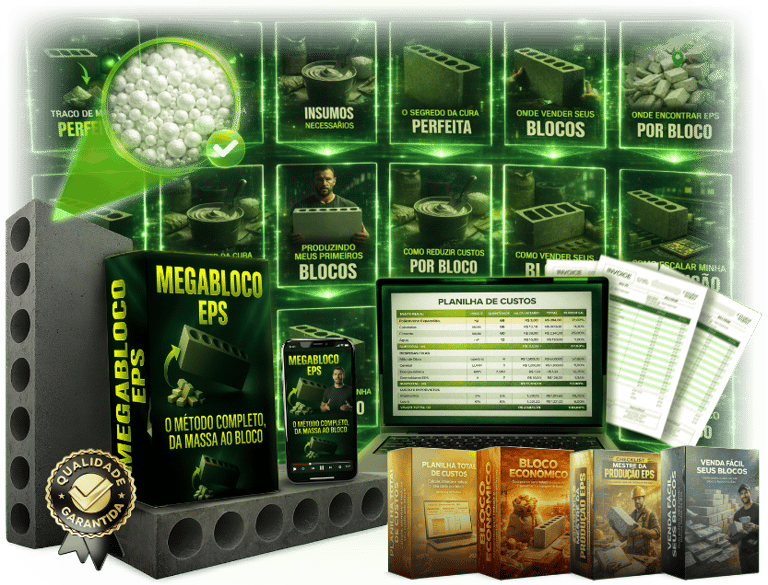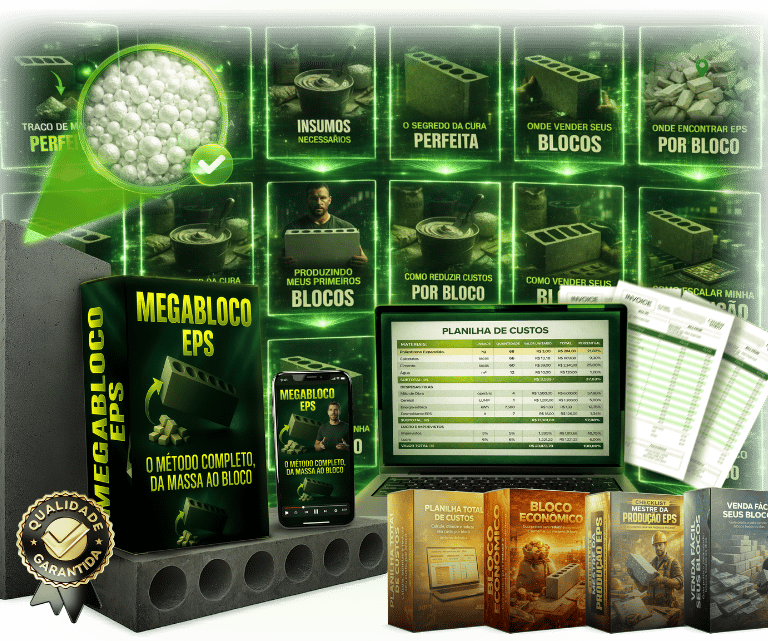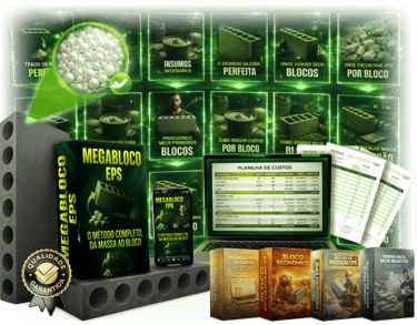 Mega Bloco EPS, é uma apostila completa + vídeo explicativo, com o passo a passo definitivo para você produzir blocos de concreto com (ISOPOR) reciclado.